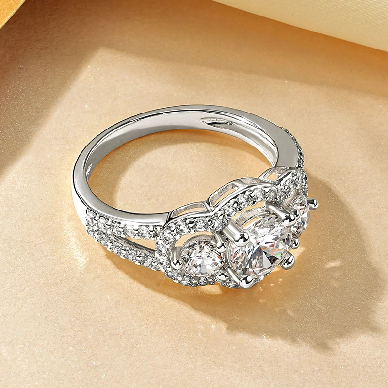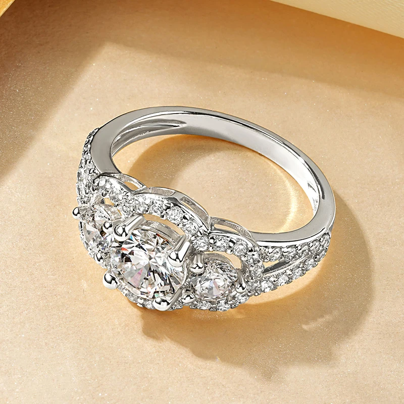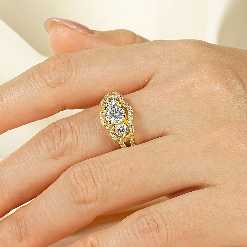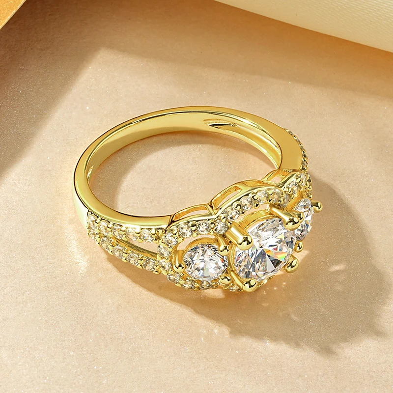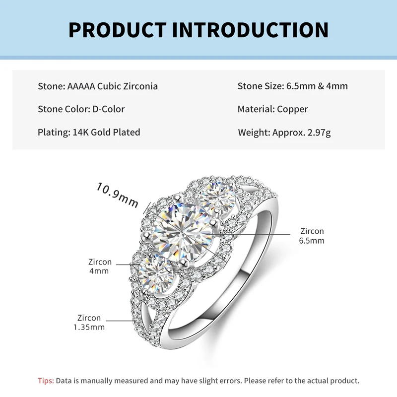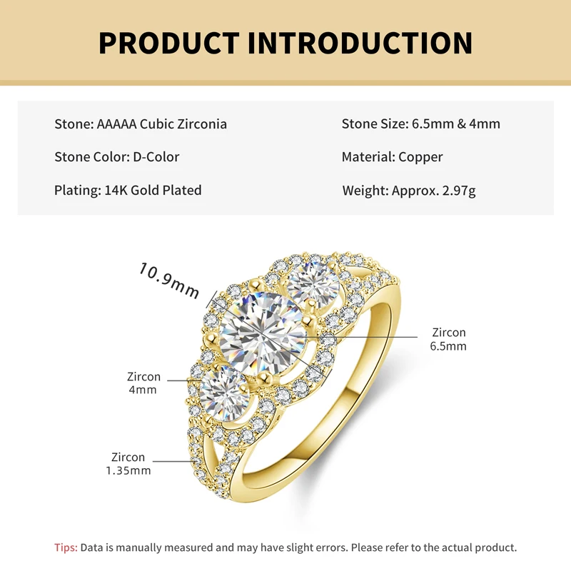 This fashion gold-plated Engagement Ring is crafted with 6.5mm&4mm&1.35mm AAAAA quality cubic zirconia stones, exquisite, luxurious, and dazzling, it's the perfect choice for those who love this design.