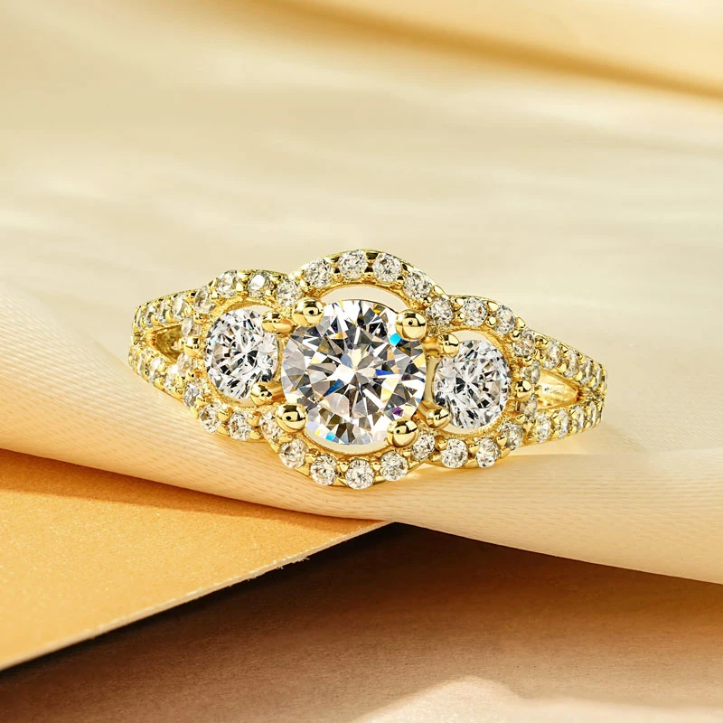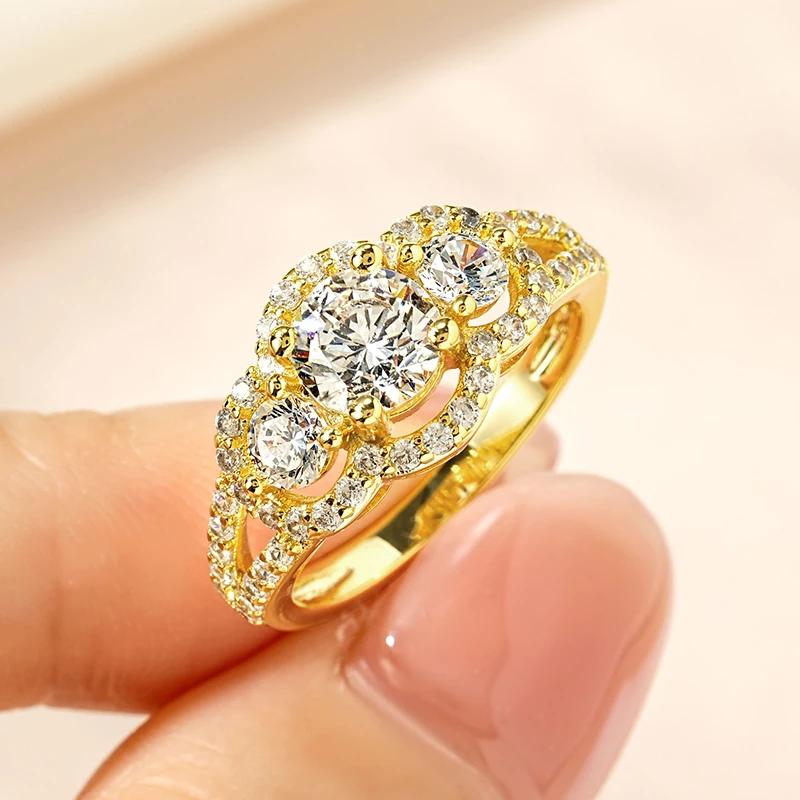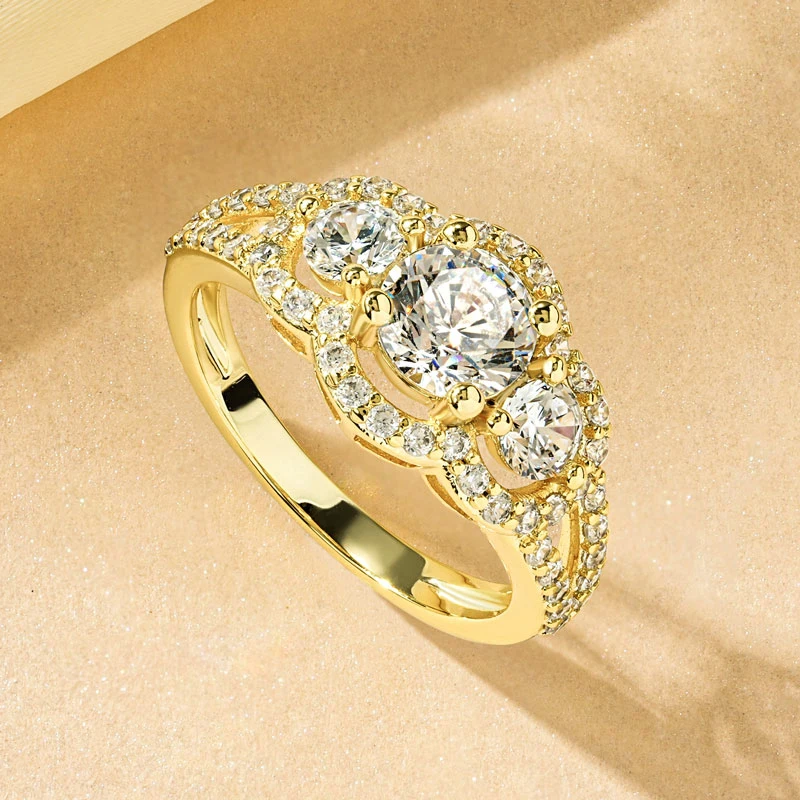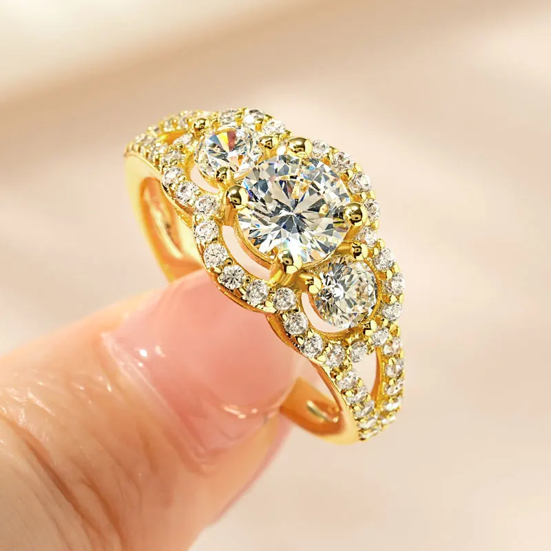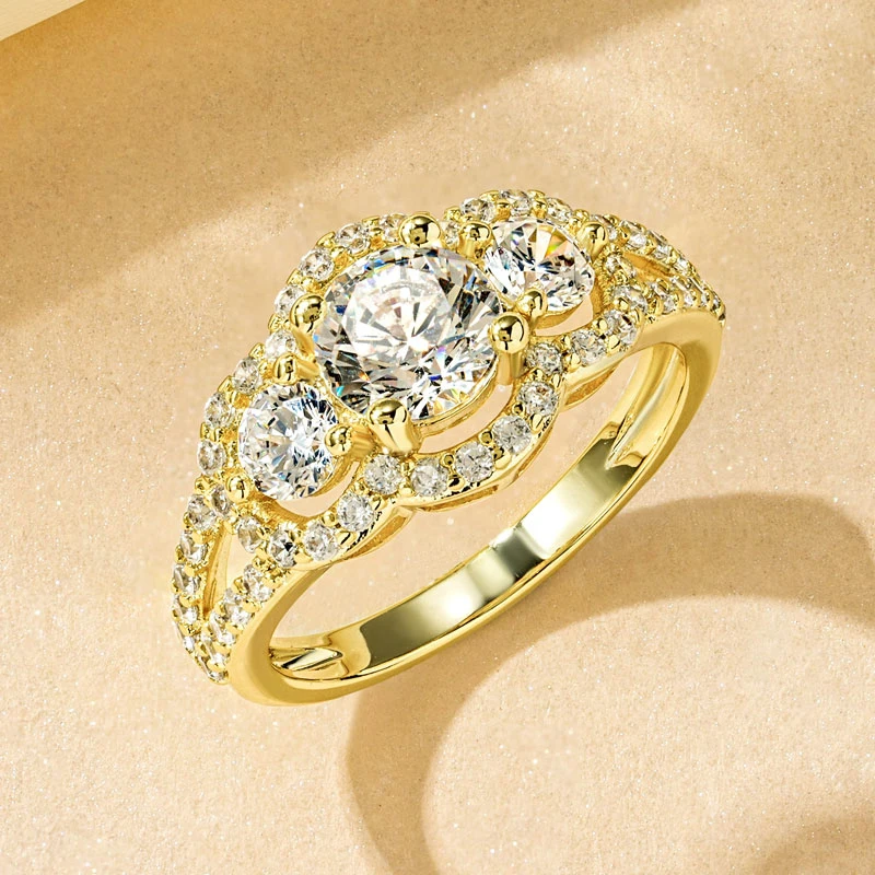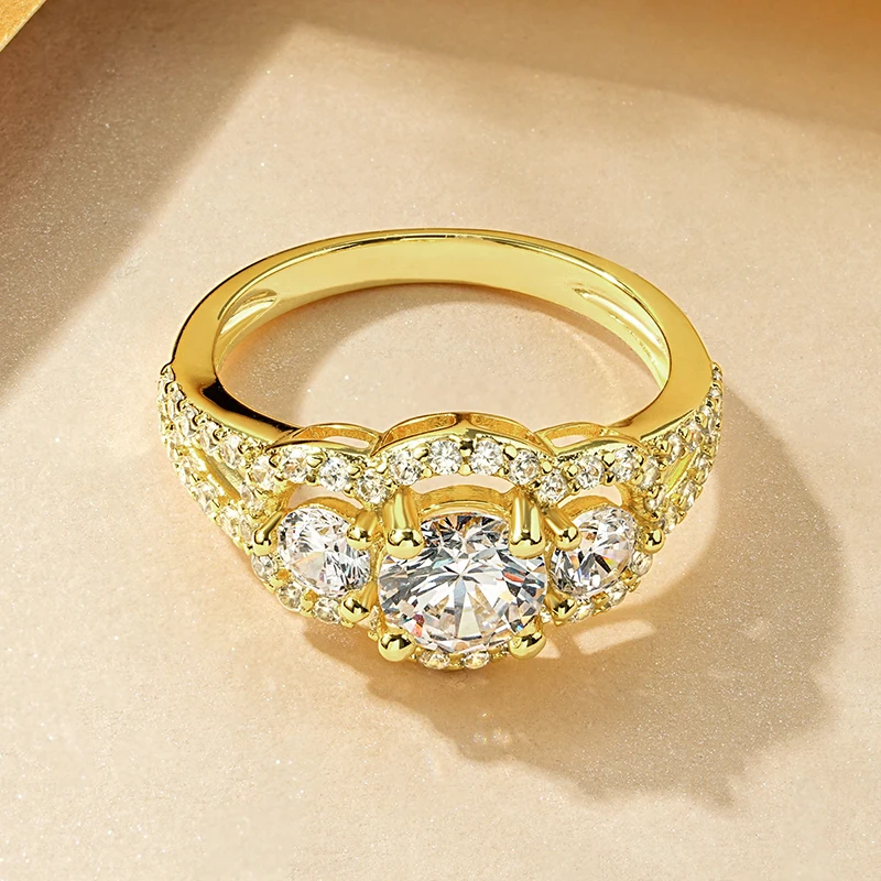 Rrjzz 14k Gold Plated Women's Rings Three Stone Halo Round Luxury CZ Simulated Diamond Engagement Ring for Woman Jewelry Gifts