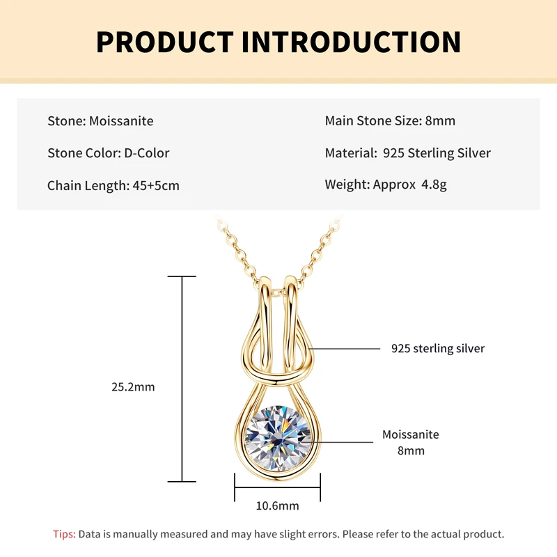 Rrjzz VVS1 Single Stone 8mm Round Moissanite Women Fashion Necklace Certificate 925 Sterling Silver Knot Women Pendant Necklace